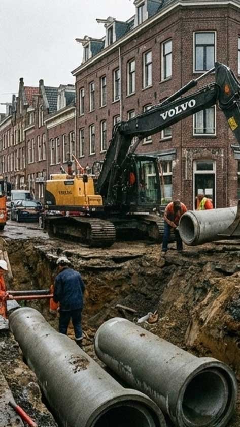 Wij leggen rioleringen aan of vervangen bestaande systemen, met inachtneming van technische normen en terreinomstandigheden. Zowel huisaansluitingen als complete tracés.
